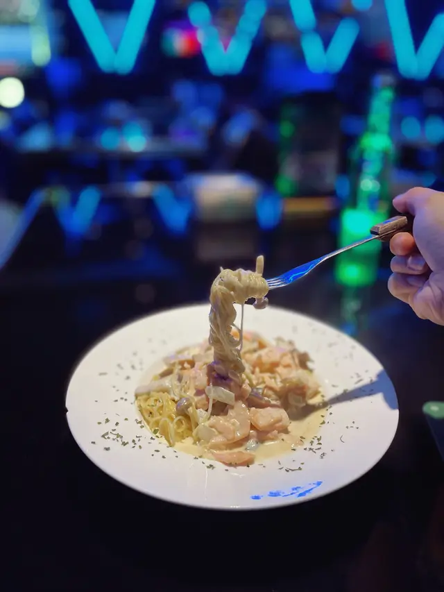 沒想過這裏會有主食😂,𝚕𝚘𝚠 𝚌𝚊𝚛𝚋 𝚍𝚊𝚢和朋友𝚜𝚑𝚊𝚛𝚎了。白汁忌廉比例多,所以吃起來會比較厚重,但三文魚厚塊狀 份量也不少!天使麵容易咬斷,但以酒吧食物質素來說,合格有餘了。