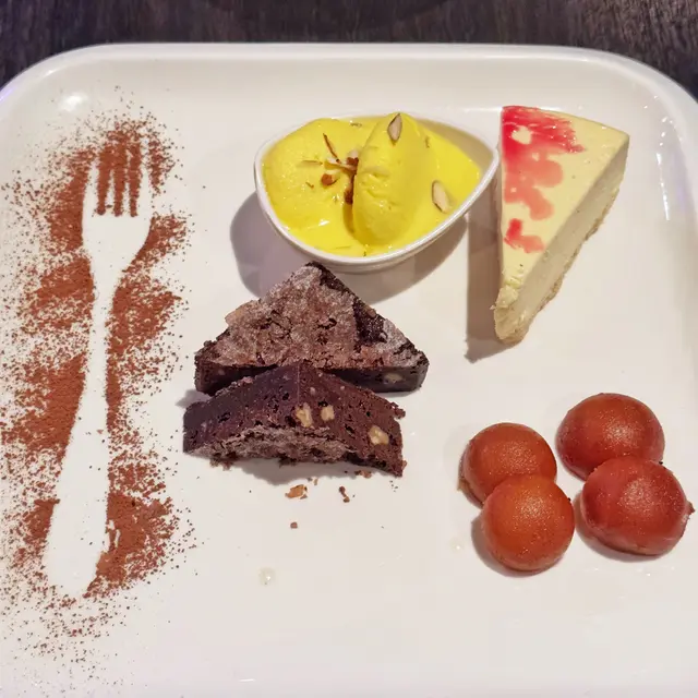 甜品拼盤😍有芝士蛋糕🍰同埋布朗尼🍫兩款西式甜品再加上🌹玫瑰炸糕同埋甜奶球🟡兩款印度甜品,十分之豐富🤩又別俱特色。芝士蛋糕🍰軟滑香甜,布朗尼🍫好濃郁,印度🌹玫瑰炸糕🟤吸收晒玫瑰糖漿係入面🤤勁甜美,甜奶球🟡係印式嘅芝士🧀️軟蛋糕仔,佢浸係芳香嘅🥛牛奶之中,食起上嚟口感好似一件充滿🥛奶香味嘅甜海綿🧽。