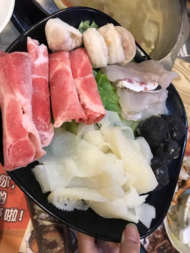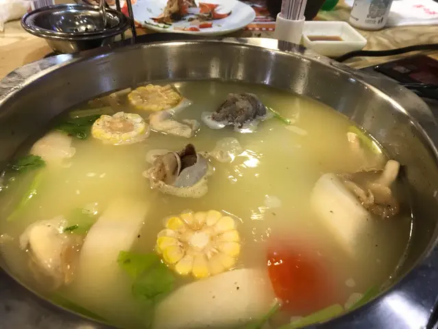 至於其他海鮮,例如鮑魚,海蝦,帶子,聖子,大蛽等等......就要等雞煲都食完,然後職員就會替我們換另一個鍋,那個鍋就是用來煮這些海鮮的。我們的鍋選擇了豬骨湯底,裡面有好大隻的豬骨,又有粟米,蕃茄等配料 ,清清的,但豬味濃郁。