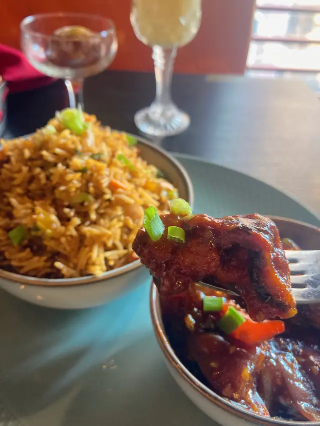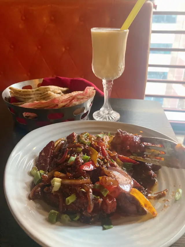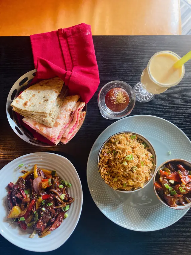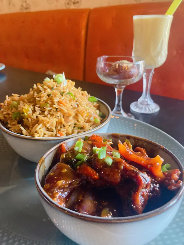 點了Chilli Chicken with Fried Rice,飲品當然要喝Mango Lassi,亦加了$20 試試甜品玫瑰丸子配果仁甜漿。