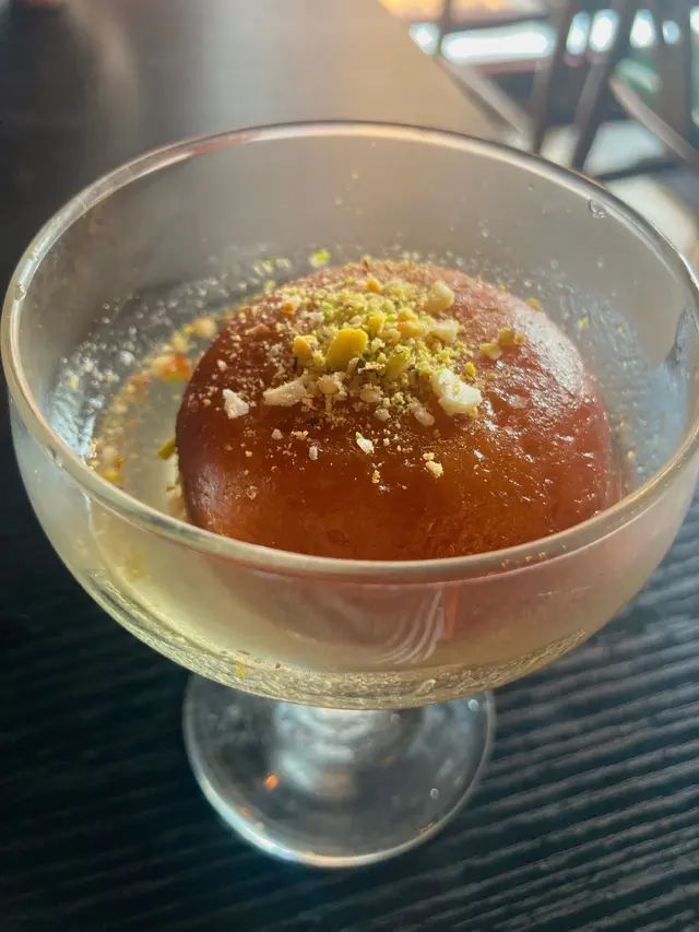 甜品的玫瑰丸子配果仁甜漿是熱食的甜品,丸子是炸過的,浸在甜甜的糖漿裡,頗特別的質感和味道。
