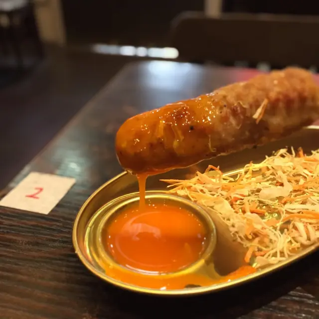 免治雞肉軟骨串一口咬下可以感受到雞軟骨特有的韌度,更有嚼勁,蘸點橙黃色的蛋漿,入口更滑溜。