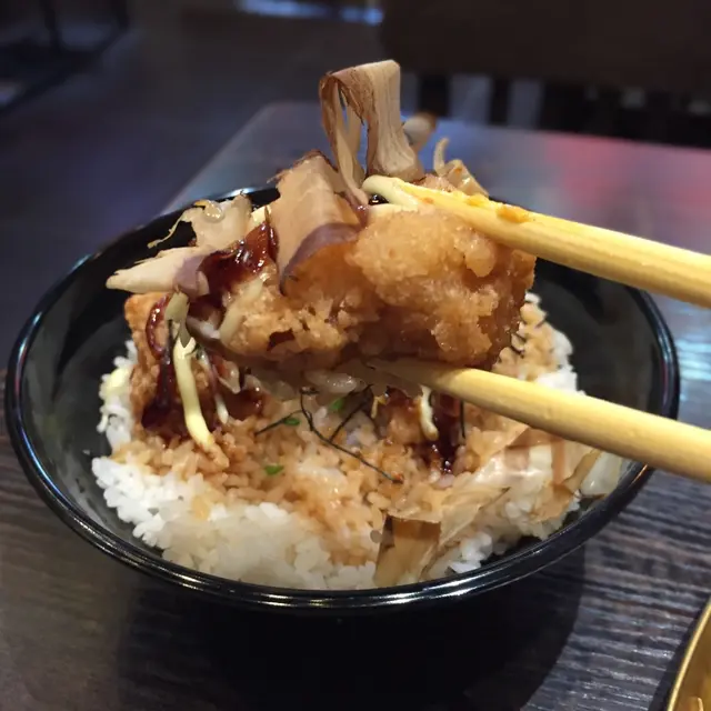 灑上木魚碎,燒汁和沙律醬,炸雞雞肉外皮金黃酥脆,雞肉保留到肉汁,撈飯一流。