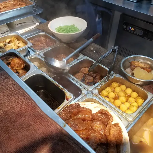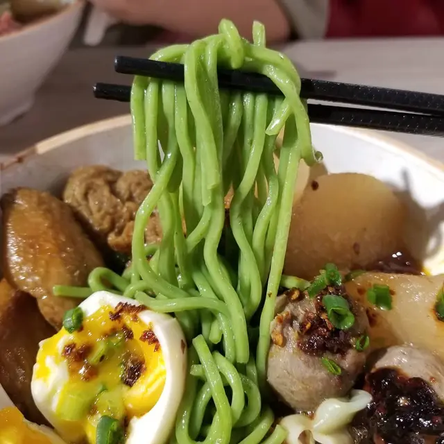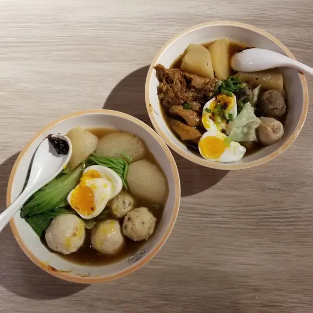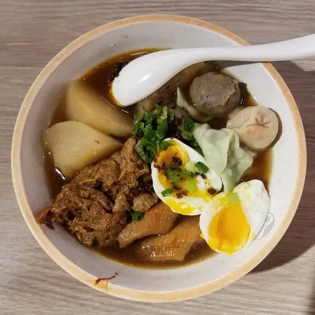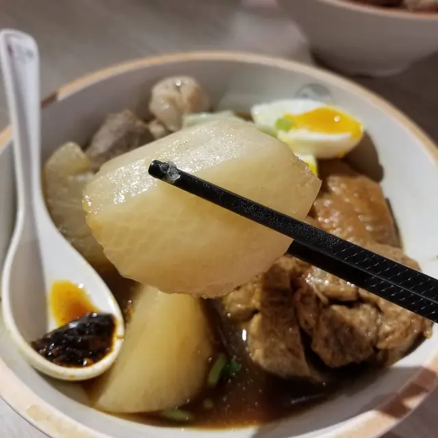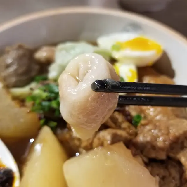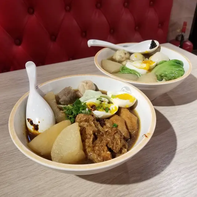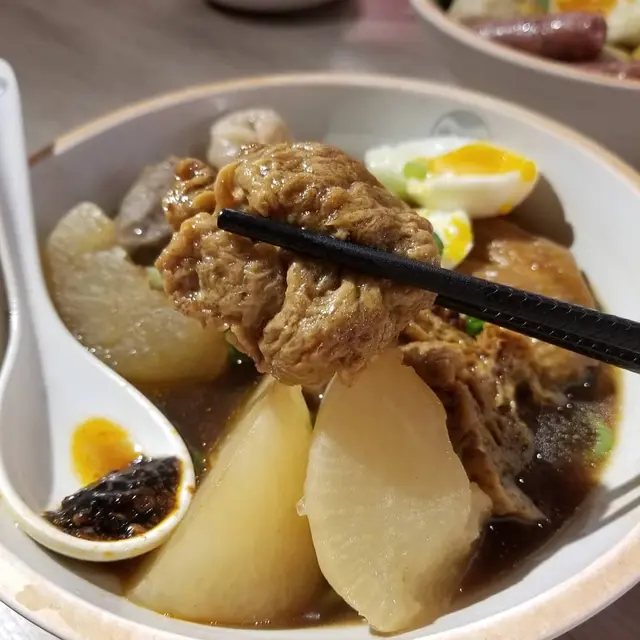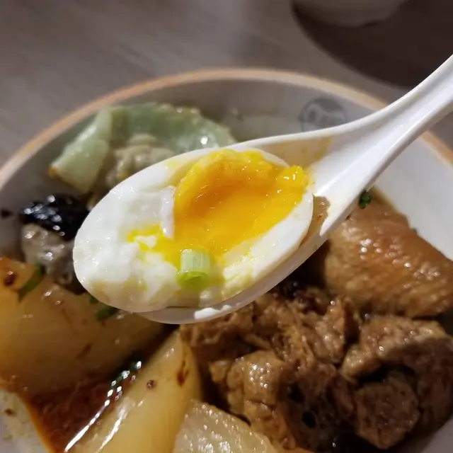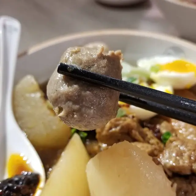 特級潮汕牛筋丸以新鮮牛肉製作,嚐起來牛肉味道濃厚,肉質紮實,挺有彈力,肉汁豐沛。熱騰騰的溏心蛋,流出黃澄澄的蛋汁,我們看見馬上口水,溏心蛋十分軟滑。
