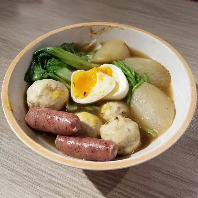 朋友則吃六款配料,甜心蘿蔔,溏心蛋,油菜,特級包心丸,台灣黑椒腸與章魚燒。特級包心丸比一般丸子大顆,內裡包覆肉餡,非常飽滿,湯汁濃香,美味可口。章魚燒口感細緻,香脆彈牙,吃在嘴裡可感受到章魚的活力,台灣黑椒腸味道較重,胡椒香辣惹味。