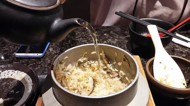 最後留少少飯,倒入泡茶,加紫菜片,又係另一種滋味食法。米粒有埋淡淡茶既清香,底下有飯焦都好正。