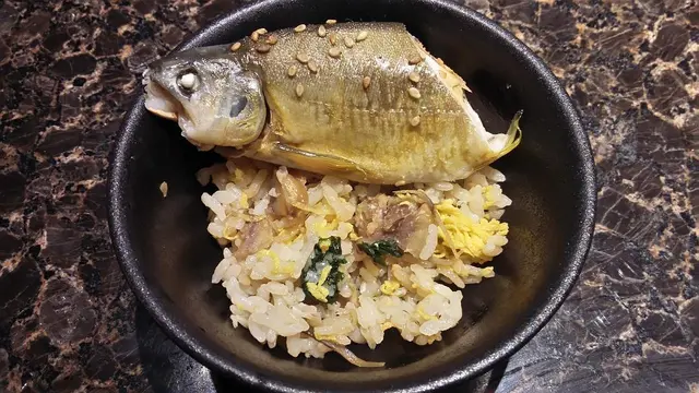 香魚一大條,骨唔算多,容易食,飯內有魚仔,栗子,冬菇絲,雞蛋絲,撈勻就食得。