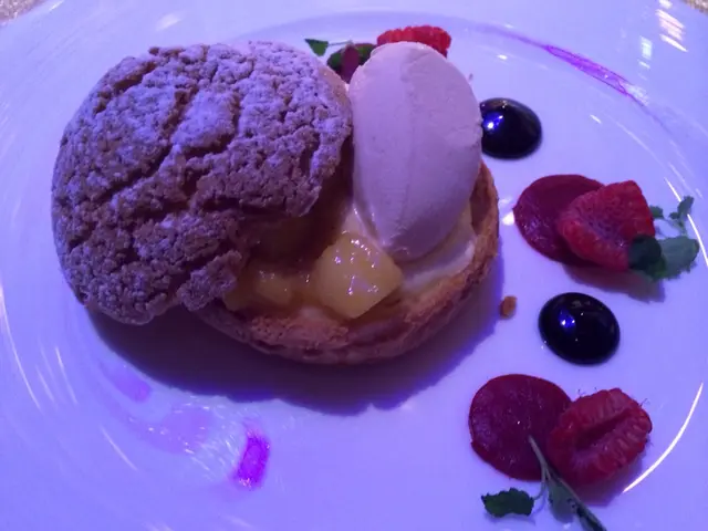 The profiteroles turned out as one huge muffin like pie, which was quite difficult to eat. Ended up just tasting the icecream which went well with the warm grilled apple slices. The chocolate sacue on the side was nice too with the rasberries.