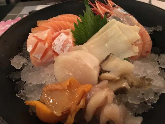 先來一客刺身,包括:三文魚,鮑片,赤貝,象拔蚌,螺片,甜蝦,帶子。