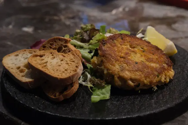 The crab cake is fried to a crispy perfection, enhanced by a squeeze of lemon juice that elevates the freshness of the crab meat. Each bite is filled with the flavor of the crab meat, and it tastes even better when paired with the crispy bread.