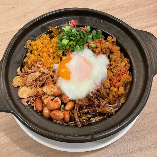 有花生粒、好脆嘅魚仔乾、炸蒜、肉碎、半熟蛋等