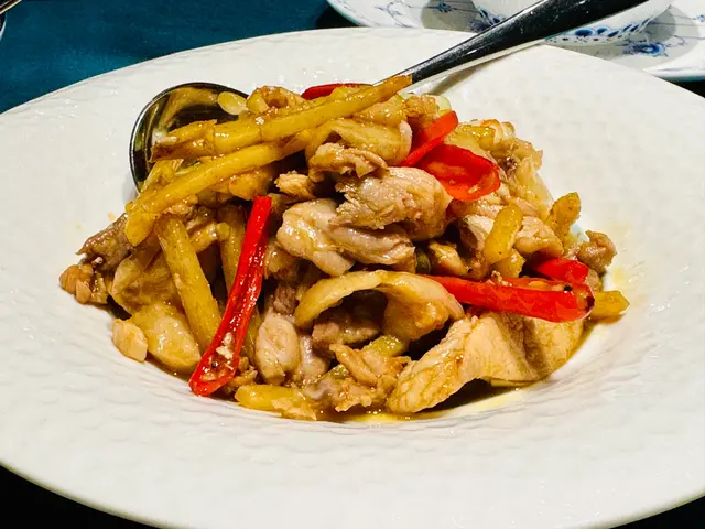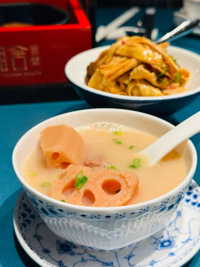 餐點從前菜涼拌腐竹開始,帶來了一個爽脆的開胃口感。接著湯品的筒骨燉湖藕湯是一道濃郁而溫暖的湯品。排骨的肉質鮮嫩多汁,與粉藕的清甜相得益彰,令人回味。