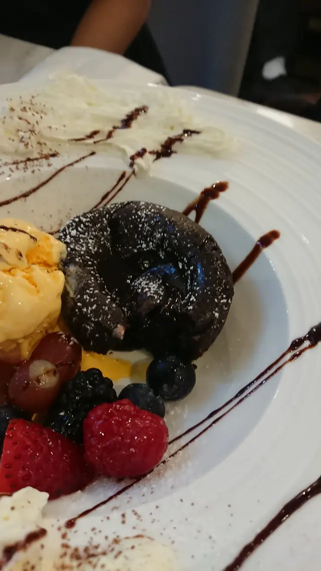 女孩們都愛甜點,甜品選了心太軟,餐廳以闊邊碟上菜,除了主角外,還配有芒果雪糕、滿滿的雜果,以及百力枝,讓人感到很豐盛!
