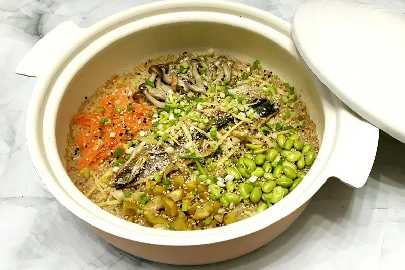 3. 在飯面放鯖魚、本菇、栗子、枝豆和甘筍,撒薑絲,再煮至米熟;在鍋邊澆麻油,開大火燒15秒,熄火,焗5分鐘,撒芝麻和蔥花。