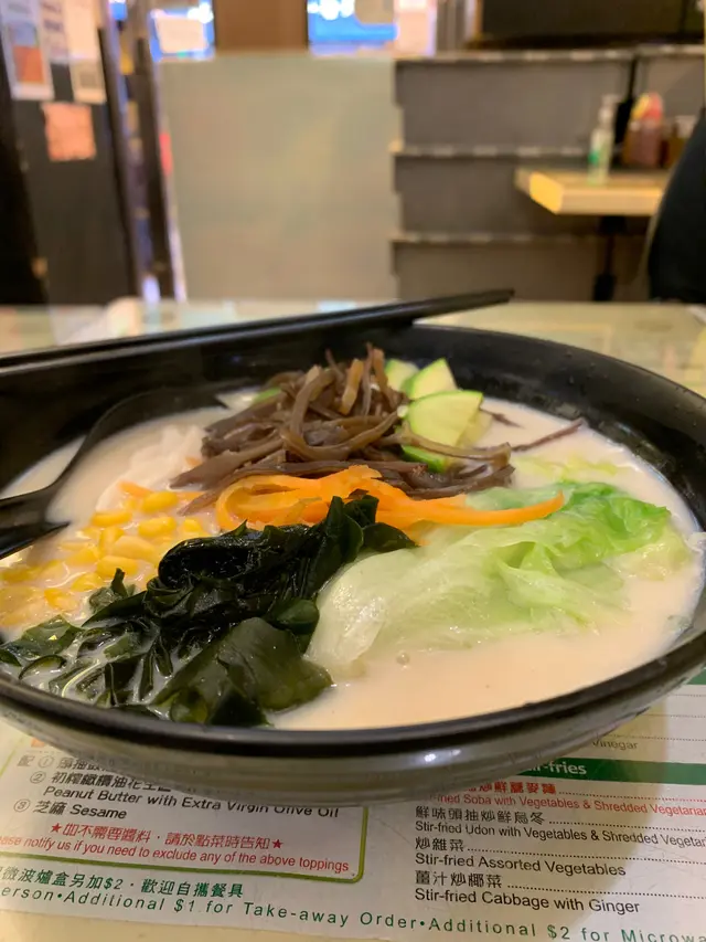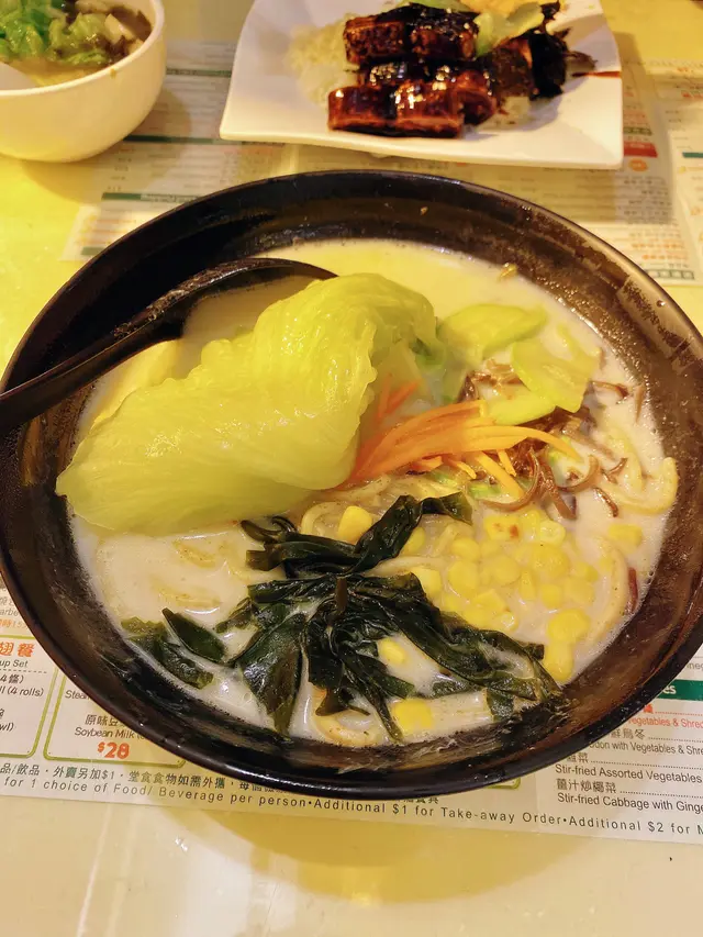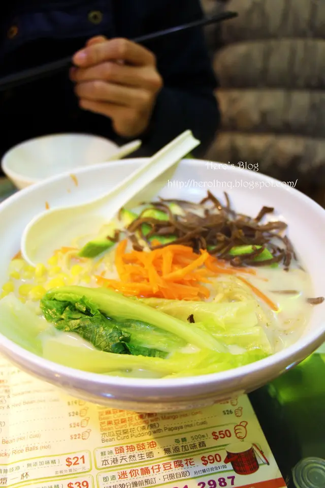以前久不久有經過這間位於旺角砵蘭街的素食店,印象中開業都有很久了,不過附近食肆林立,一直都沒有甚麼興趣去嘗試這間令人感覺傳統的「齋舖」。直至早幾天,一位喜歡食此店的朋友說老闆準備休息一下,再找個地方搬遷;雖然沒有光顧過,但一直有印象此店的存在,決定去試試她們的食物。就如其名,原來小店專門做豆漿、豆腐花等豆類製品,剛坐下也聽到不同檯的食客落單點此類豆品,想必味道應該有保證。素飯和湯麵各有八款,下午茶時間來到不想食得太飽,又想試試她們的豆品,決定點一碗湯麵。老闆聞聲即應,為我下單後,大概廚房的姨姨是新來的,老闆鼓勵她可以嘗試製作我的餐點,一步步引領她,最後送上一碗努力學習製作的湯麵。五色全素湯麵($46)色彩鮮豔,有西蘭花、生菜、粟米、紅蘿蔔絲,還有一大堆我喜歡的木耳絲