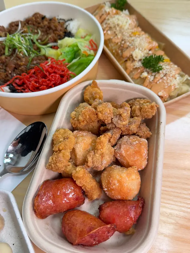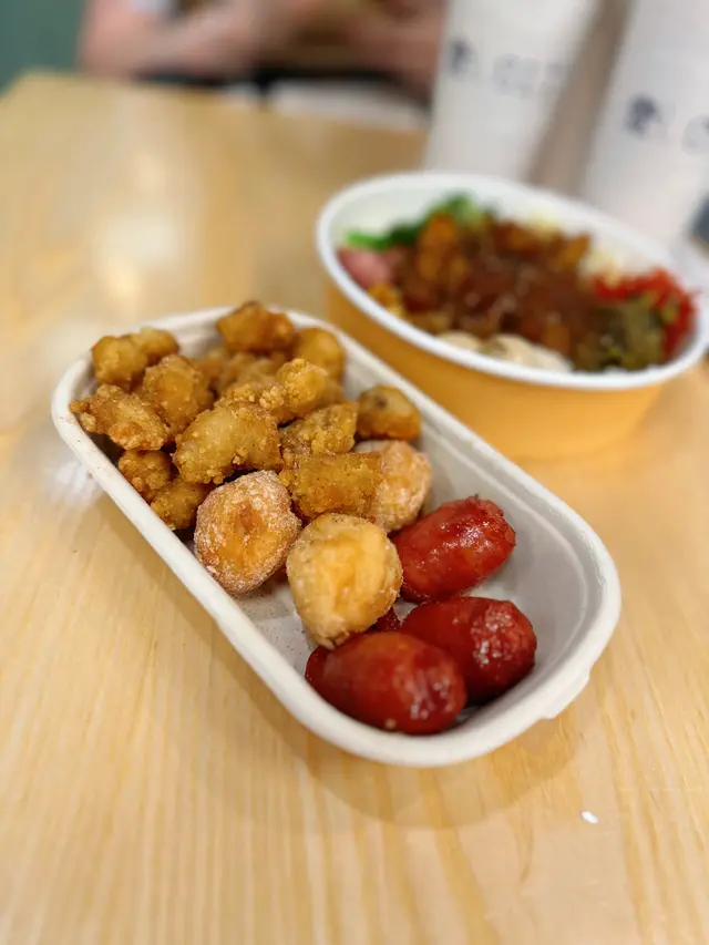 🫔 熔岩蛋之戀/拉絲芝士火腿蛋餅($45)蛋餅上枱嘅時候熱辣辣,蛋餅上面有少許花生碎,蛋餅皮好香脆,而且入面嘅芝士仲可以拉絲🍱 台北夜市小食拼盤($45)有台灣腸,花枝丸同鹽酥雞,份量唔少;台灣腸外脆內juicy,花枝丸好彈牙,鹽酥雞味道適中,食完唔會好頸渴🍱 手撕雞便當($67)手撕雞份量比我想像中要多,而且好嫩滑便當有好多唔同嘅配菜,有菜脯、酸菜、椰菜,西蘭花同豆枝,最驚喜係竟然有我好鍾意食嘅鵪鶉蛋;椰菜同西蘭花用咗姜去煮,減低左菜嘅草青味🍱 蜜汁排骨便當($68)排骨用咗酥炸方式烹調,而且係即叫即整,所以要等大約10分鐘;排骨好鬆脆,食落唔油膩,而且面頭撒上左梅子粉,甜甜地提升左排骨嘅鮮味🧀 芝·芋頭鮮奶-中($37)上面係芝士奶蓋,中間係鮮奶,底層係滿滿嘅芋泥,芋泥好幼滑,就算我叫左少冰,飲落去都唔會太甜飲到最尾其實仲有好多芋泥,單靠紙飲管係食唔到🥲如果提供埋匙羹俾客人就更好🧉 爆珠馬蹄椰子水-中($28)椰子水好清甜,加上馬蹄做嘅爆珠,消暑解渴之餘仲有啲口感…Read More