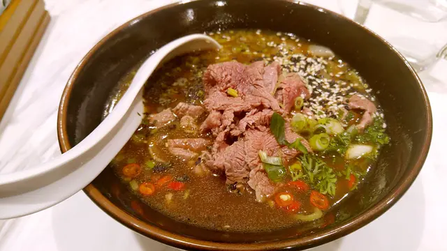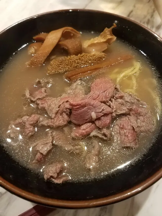 今次午餐去左間專食牛嘅麵店一個麵可以配一款小食或一杯野飲 要成100蚊都幾貴叫左個半熟新鮮手切牛肉麵加牛丸🐮麵條同湯底都可以自己揀 我就揀左招牌蛋麵130gram湯底就要左黑牛骨湯 但我就覺得麻麻唔算好濃牛味牛肉幾新鮮重肉味 但肉質就比較韌 一啲都唔嫩🐂牛丸方面就比較出色 食得出係足料唔粉糖心蛋都唔錯 如果無左上面啲配料會更好🥚服務方面都幾熱情有禮 會介紹一下店內招牌麵但當日坐吧枱有人行黎行去都會整到不太舒服…Read More