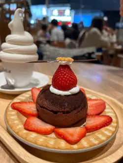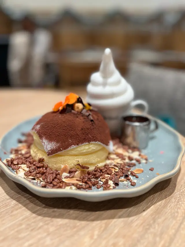 朱古力麻糬梳乎厘班戟配北海道牛奶軟雪糕,首先賣相超靚,疏乎厘非常鬆軟,入邊藏着麻糬,增添層次,而且有朱古力醬可以自己調配,好味。
