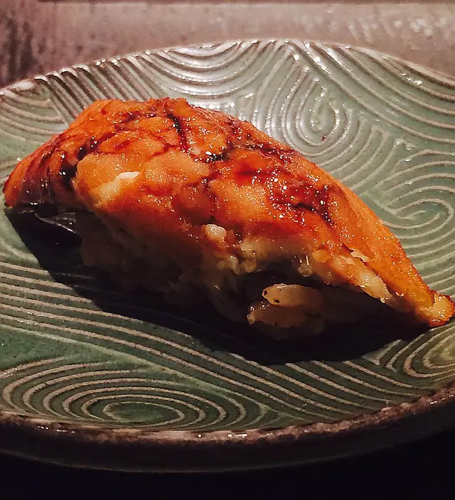 三文魚子軍艦又係一道沖擊,三文魚子顆顆分明,食落口卜卜聲。而紫菜好香好脆,係握壽司前有翻熱過,保持脆身。由於師父已經係三文魚上沾上醬油,而且醬汁之中有少量柚子,所以係絕對唔需要再加醬油去破壞佢既鮮味。認真既,真係好鮮好甜好好味!