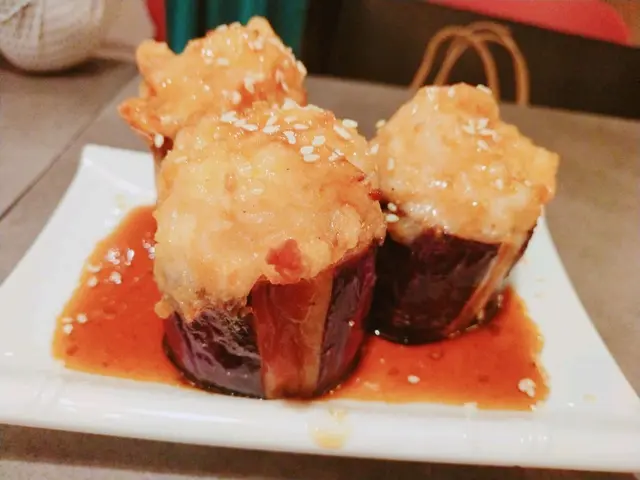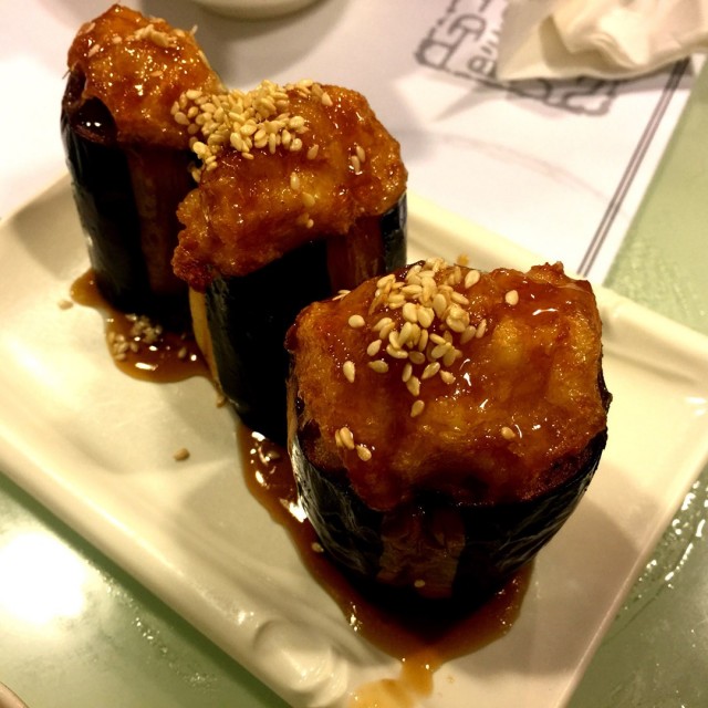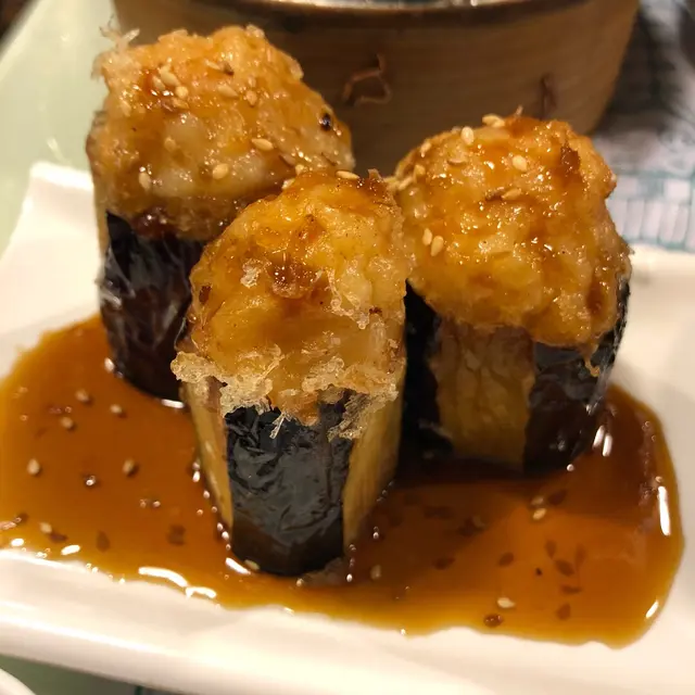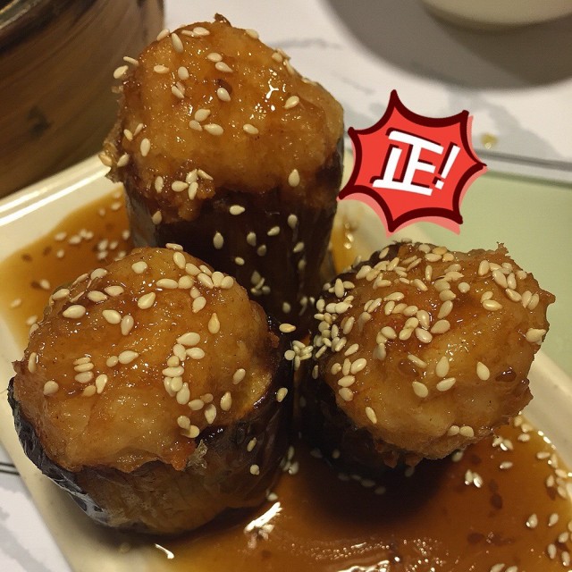 朋友們成日出黎旺角開完會都會去哩度食野,所以我今日都跟埋佢地去食下點心先,我地叫左燒汁虎皮尖椒、燒汁釀茄子、醬皇蒸鳳爪、金沙肥豬仔流沙包、黑松露野菌腸。燒汁釀茄子先上檯: 食落口,魚肉甜甜地,非常彈牙,好味