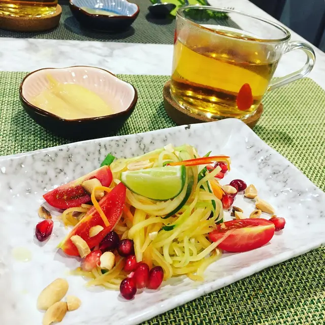 食肉獸的我間中都要吃一些素食平衡一下,跟靚女foodie共聚,各吃了豐富的晚市套餐 ($275@)前菜小食四款🌱 醋漬子薑🌱 涼拌秋葵🌱 韓式烤粟米🌱 羅勒番茄蔬菜丸子🌱 石榴籽青木瓜沙律🌱 牛肝菌花椰菜湯🌱 黑松露芝士炸薯球🌱 日式蒟蒻伴蕎麥麵🌱 士多啤梨豆腐布丁🌱 決明子菊花杞子茶坐下就來了一壺養生茶🍵,清熱解喝。第一款前菜是醋漬子薑,少少酸辣相當醒胃。之後來了三款前菜我都很喜歡,味道都是很香口的,尤其番茄蔬菜丸子很特別😍!之後上的是沙律🥗,有點像泰式的帶點酸辣,口感清新。椰菜湯大大碗,配料攪成粉,喝上口是一粒粒,很香很好味,配上有營養的麥包,靚女foodie話,已經有飽肚的感覺。炸薯球🌕內面有黑松露芝士,相當特別又惹味,黑松露的味道十分突出,炸得相當出色。蕎麥麵🍜中有蒟蒻,少少咸香很滋味。最後的豆腐布丁🍮吃上去有淡淡豆腐味,原來與士多啤梨如此合襯🍓。這是美滿的一餐,食物高質,可以翻桌!還有熊貓筷子坐很可愛🐼,更可以即場買小擺設。…Read More