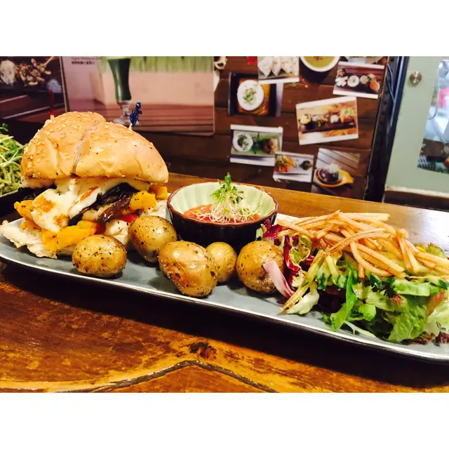 想食漢堡,塊肉又太heavy, 所以想搵素漢堡食。呢間舖門面唔大,得十零個位,已經坐到出門口。叫左個素漢堡餐同黑松露雜菌意粉,仲有沙津,磨菇湯,同蕃石榴+紅菜頭+蘋果汁。個磨菇湯真係好磨菇,哈哈