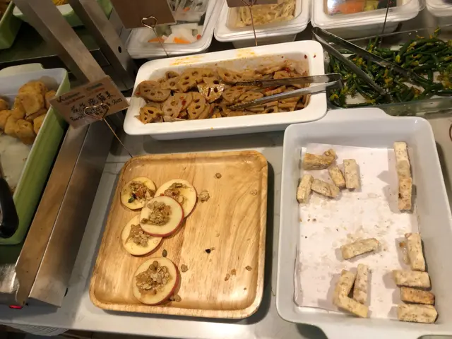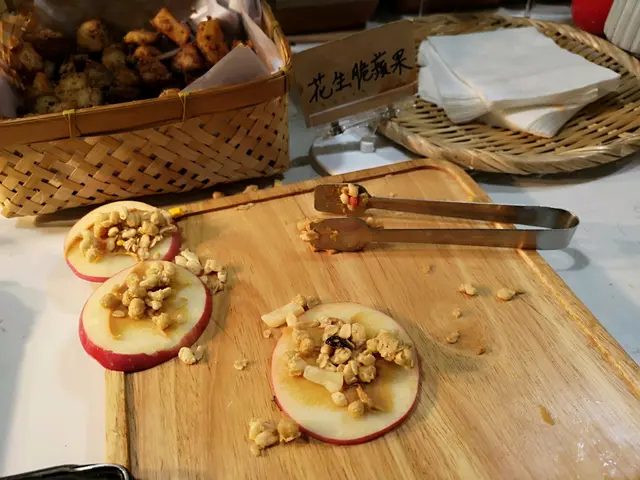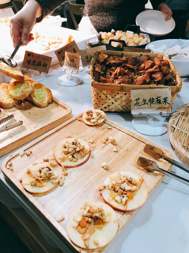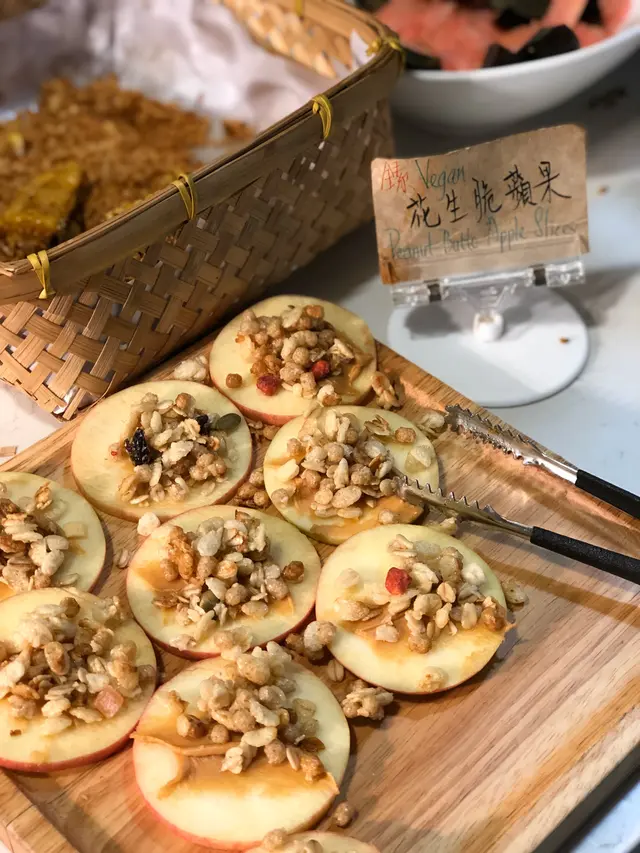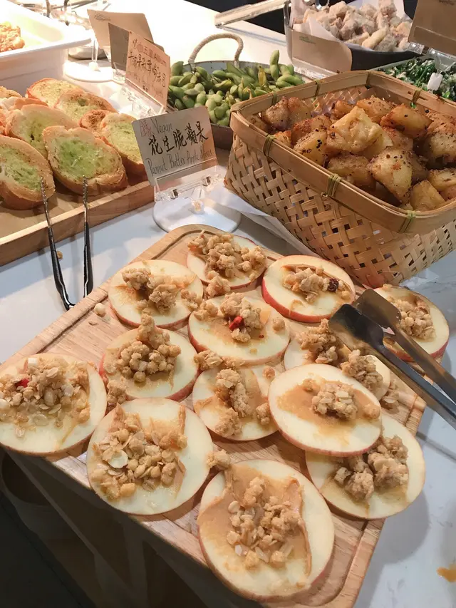 沙律菜、羽衣甘藍、水蜜桃、etc紫薯球好食,甜薯味,中間有馬蹄,口感唔錯,但食多一粒就太飽咕嚕合桃個咪係唔錯,但口感一般。炸鮮奶夠熱好香口蜜瓜西米露味道普通每樣拎d拎d 拎左幾轉都未試哂d野。椒鹽豆腐、黑椒薯仔粒都好好食,拍得住出面d小炒質素,不過如果果盤放得耐質素應該會差好多。漢堡就一般,留肚食其他野好d。食物牌會寫明蛋素、奶素、五辛,令各類素食者好易睇到岩唔岩食。