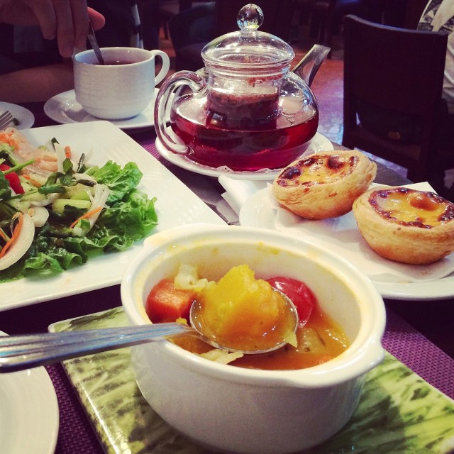 等登過路環《安德魯花園咖啡》目的當然係為左葡撻。上次去澳門食過《瑪嘉烈蛋撻店》覺得幾好味,但因為睇openrice 見到佢近來既服務態度好差,所以就揀左另一間,睇d食評都話呢度好正,所以專程咁遠過黎。 店舖好細得幾張檯,到達時已經坐滿客,等左20分鐘先有位。入到去見到水吧已經放左d葡撻,好似唔係新鮮出爐咁。我地每人叫左一個,見佢上菜前要將d葡撻放入焗爐番熱!Oh No!