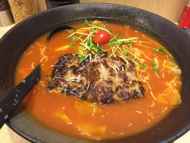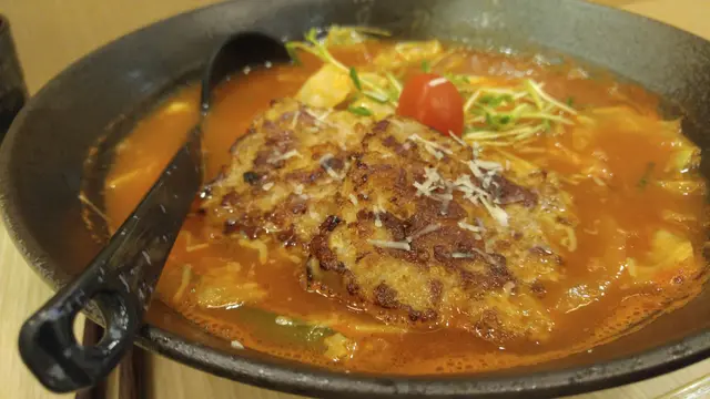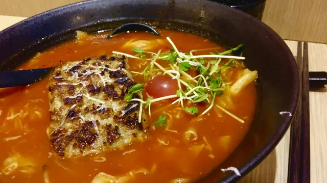 呢度所有都係蕃茄湯底 聽訪問話老闆唔想做到雜哂 想專注做蕃茄湯底嗌左蕃茄茄子麵($85)同蕃茄漢堡扒麵($90)價幾黎講都幾貴 不過正宗既拉麵都大約呢個價錢即管試試