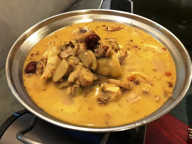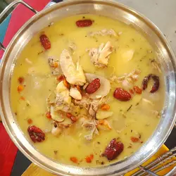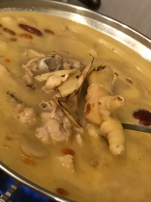 以麻油把雞炒香,放到鍋中以 gas 爐保溫,配料包括:紅棗、薑、杞子…滋補暖胃!