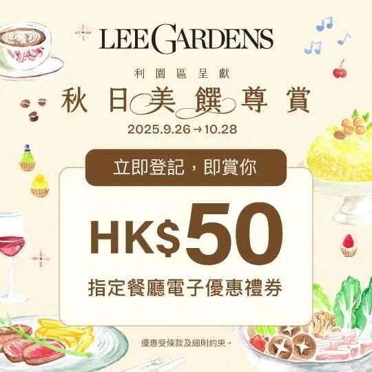 【Exclusive for Lee Gardens Area】Sizzling Fall Feasts, Receive a HK$50 Designated Restaurants e-Coupon ! Please visit the website for details.