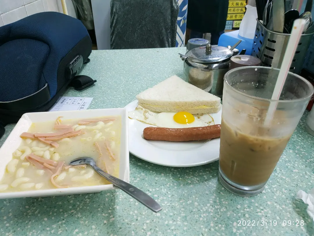 早餐G餐~火腿絲通粉、腸仔煎蛋跟牛油方飽、跟餐凍鴛鴦