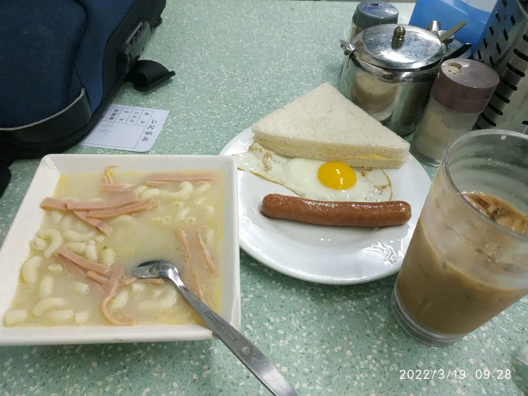 早餐G餐~火腿絲通粉、腸仔煎蛋跟牛油方飽、跟餐凍鴛鴦