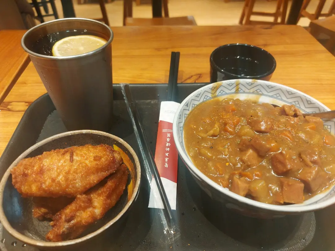 豚肉咖哩飯配炸雞翼凍檸茶