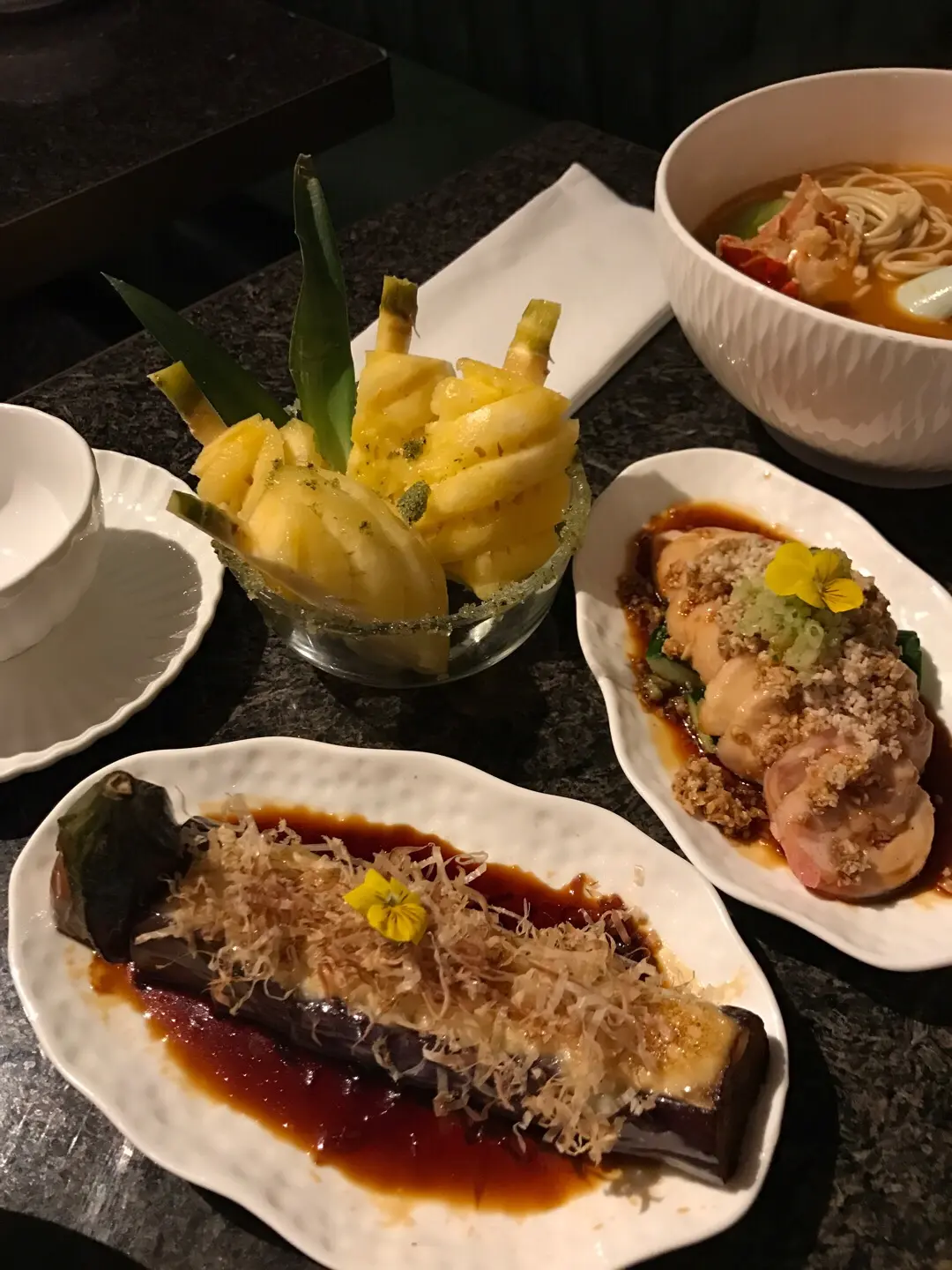 菠蘿榴彈,沙薑雞卷,木魚茄子