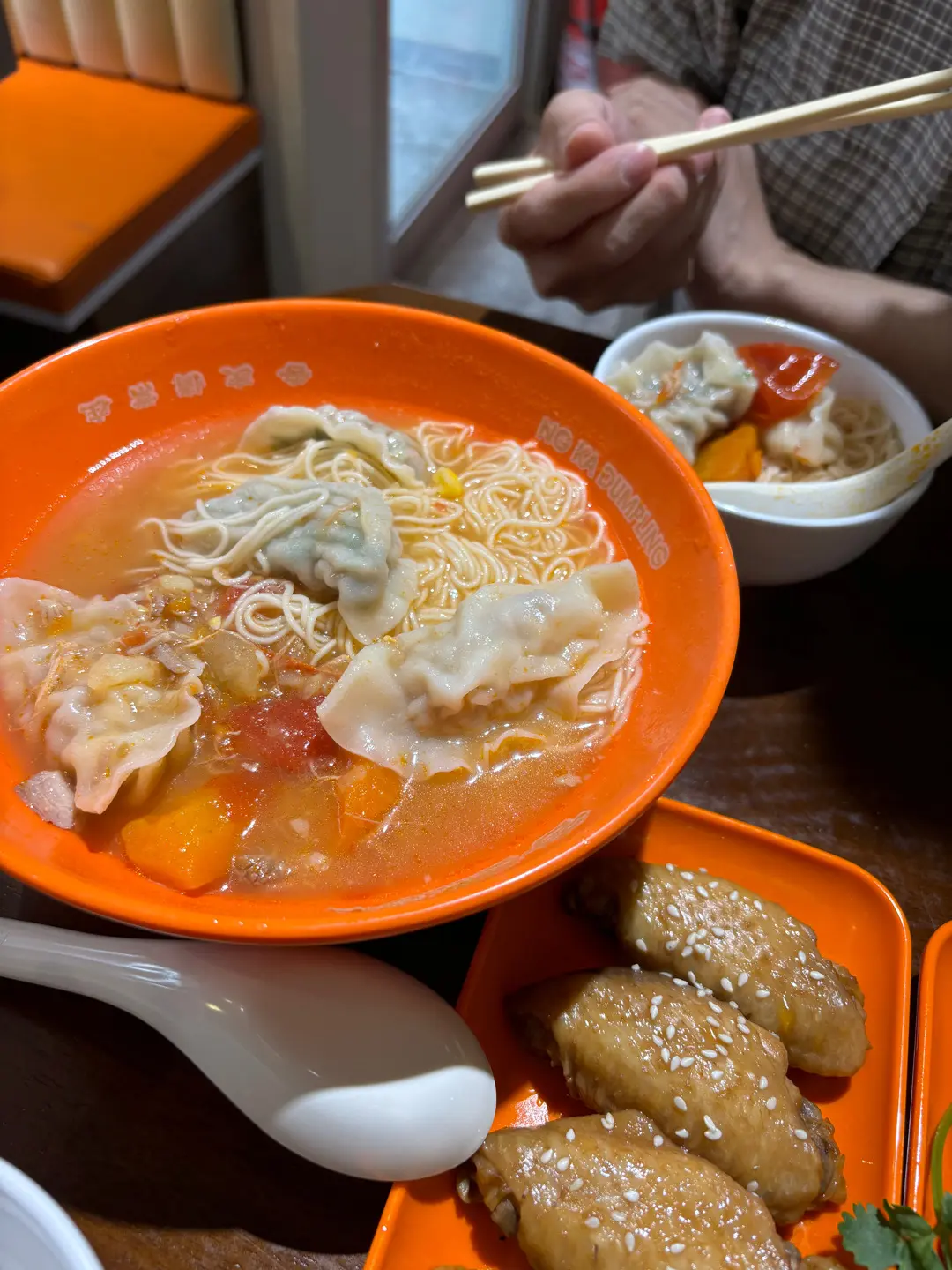 韭菜豬肉+粟米豬肉餃配淮山麵(蕃茄薯仔湯底)