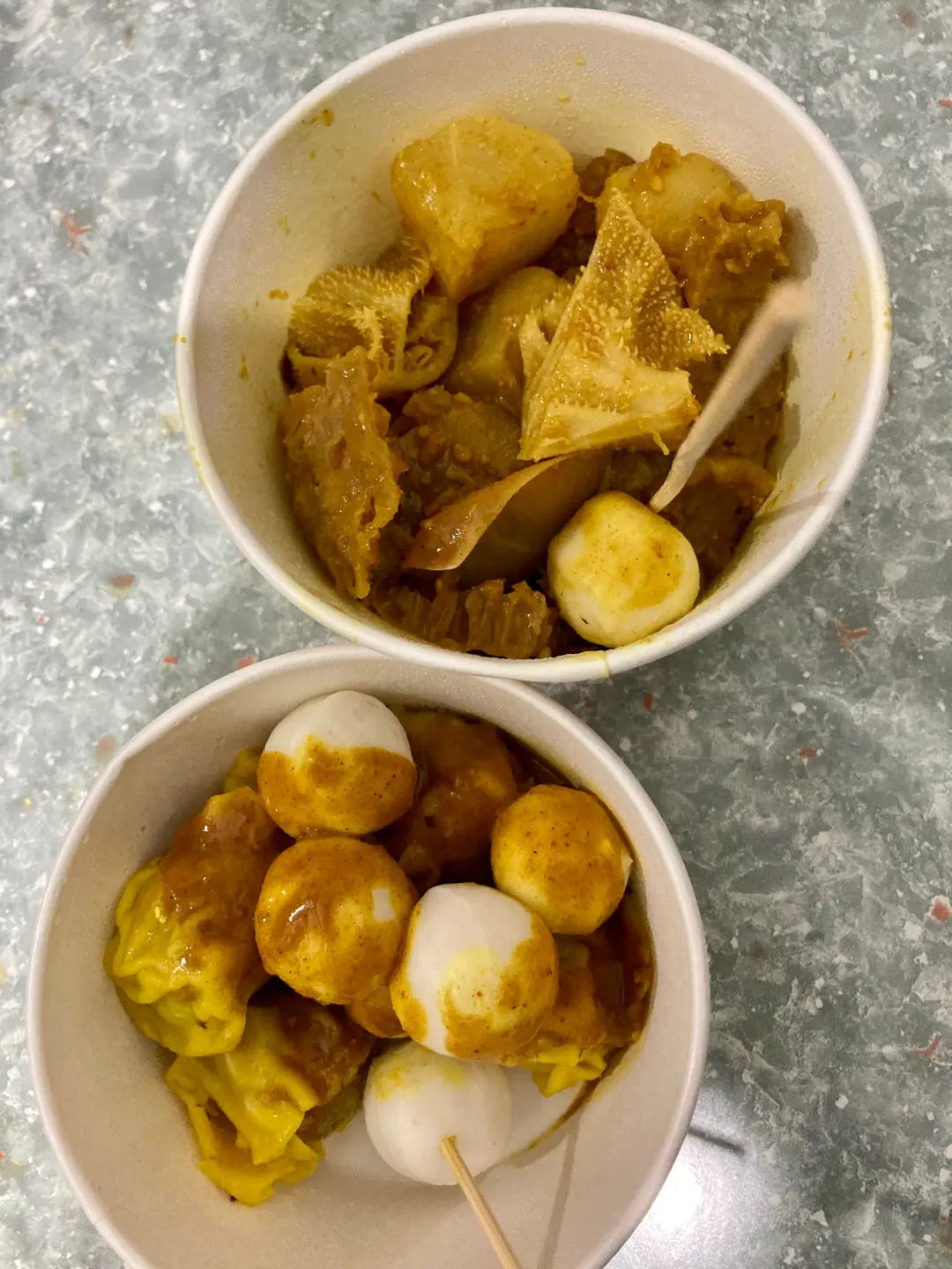 孖寶(燒賣、魚蛋)[咖哩]、五寶(魷魚、牛柏葉、豬皮、魚蛋、蘿蔔)[沙爹]