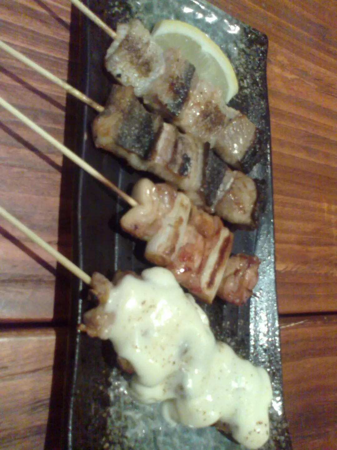 由上至下分別是:兩串鹽燒活鰻、雞肉京蔥串、雞肉芝士串