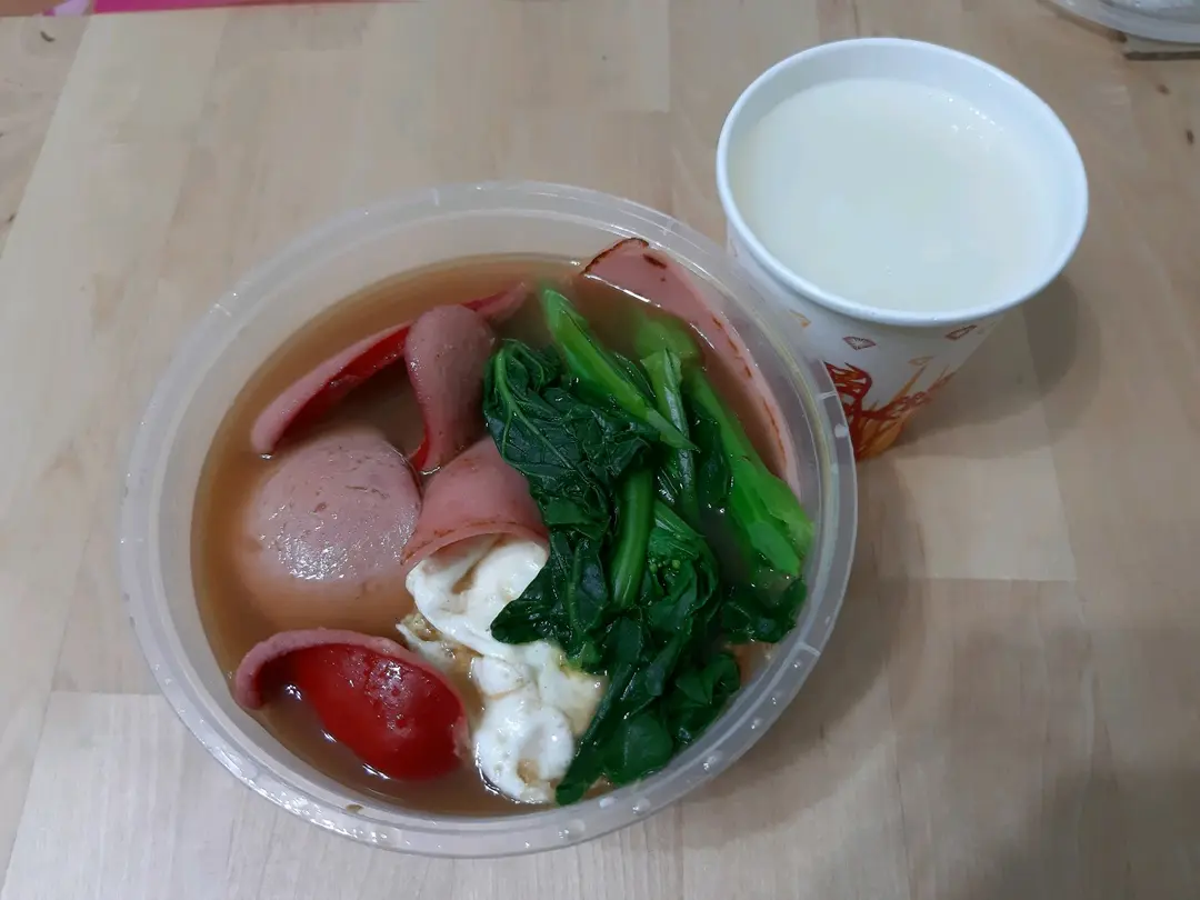 紅腸湯通粉、火腿煎雙蛋、熱杏仁霜