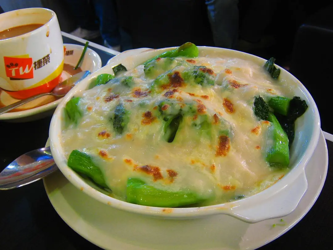 老闆話芝士焗西蘭花要「拼其他嘢」, 嚟到先知係菜心, 九唔搭八的