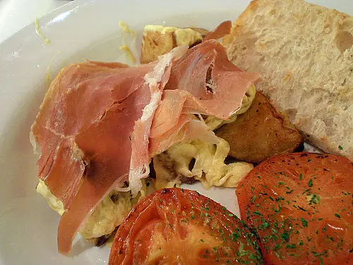 西班牙炒薯、巴馬火腿、烤蕃茄、意大利多士配熱檸茶( 西班牙炒薯、巴馬火腿)