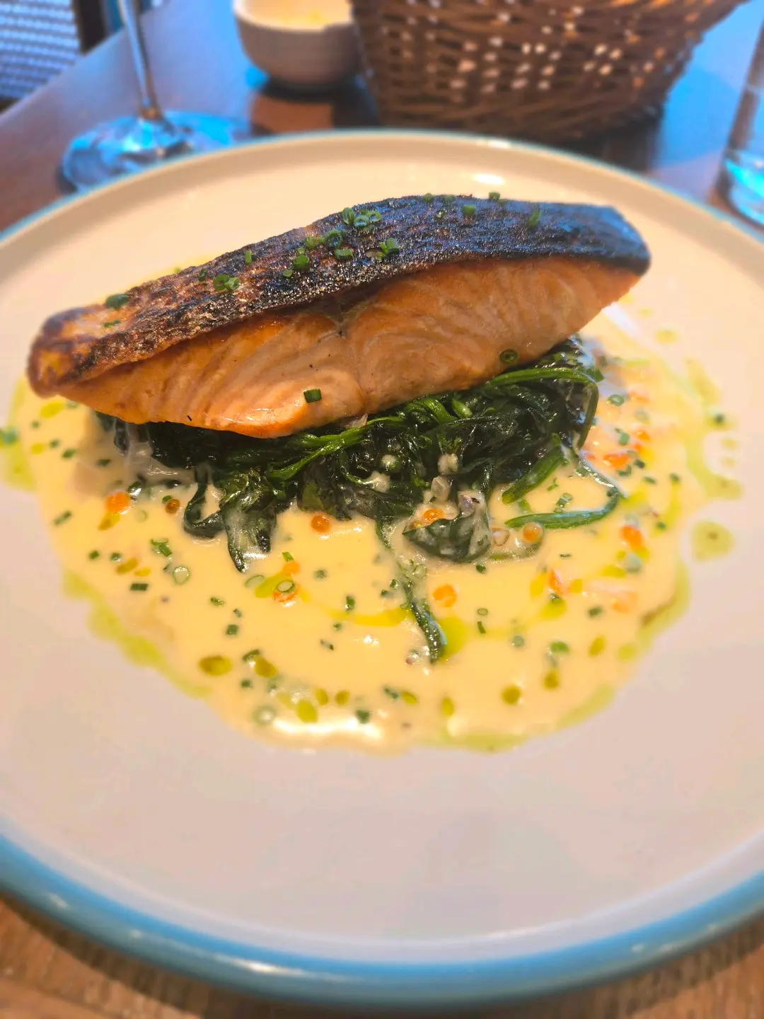 Main Grilled fish of the day Grilled Salmon with spinch beurre blanc sauce