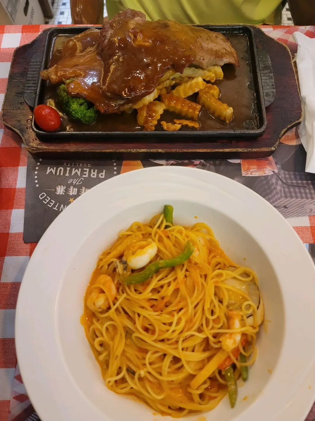 鐵板肉眼牛扒拼豬扒、 海鮮天使麵