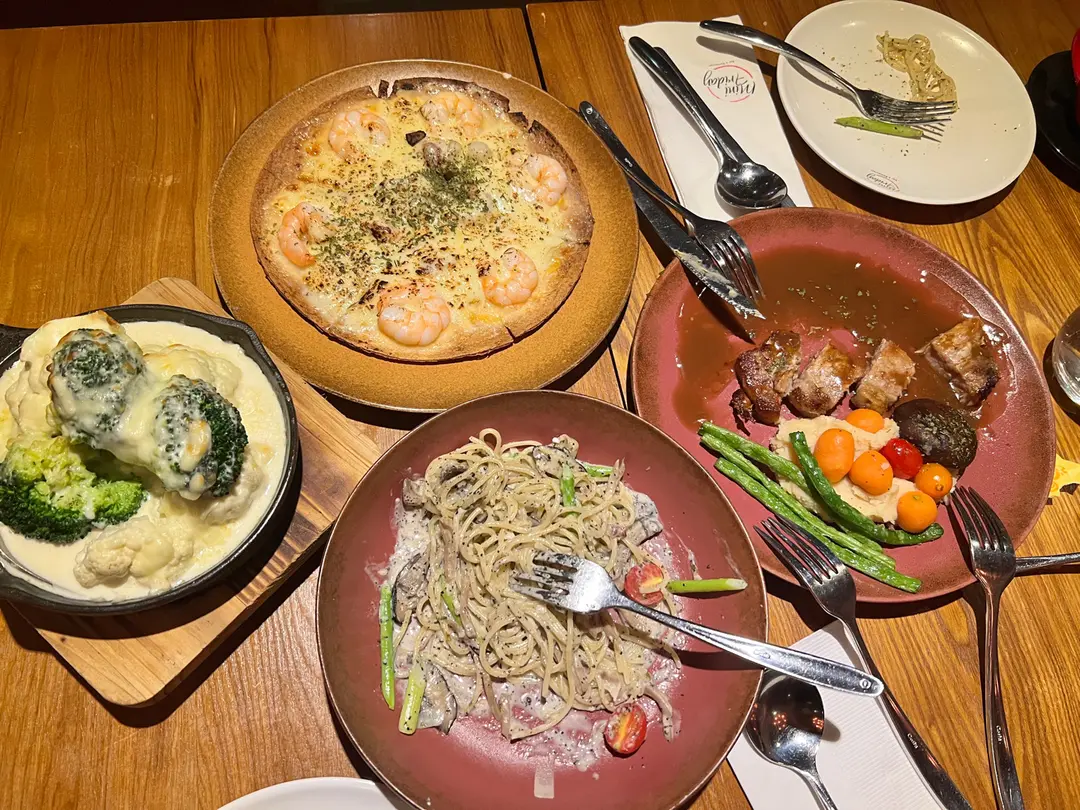 焗西蘭花,黑松露意粉,千島海鮮pizza,豬鞍扒