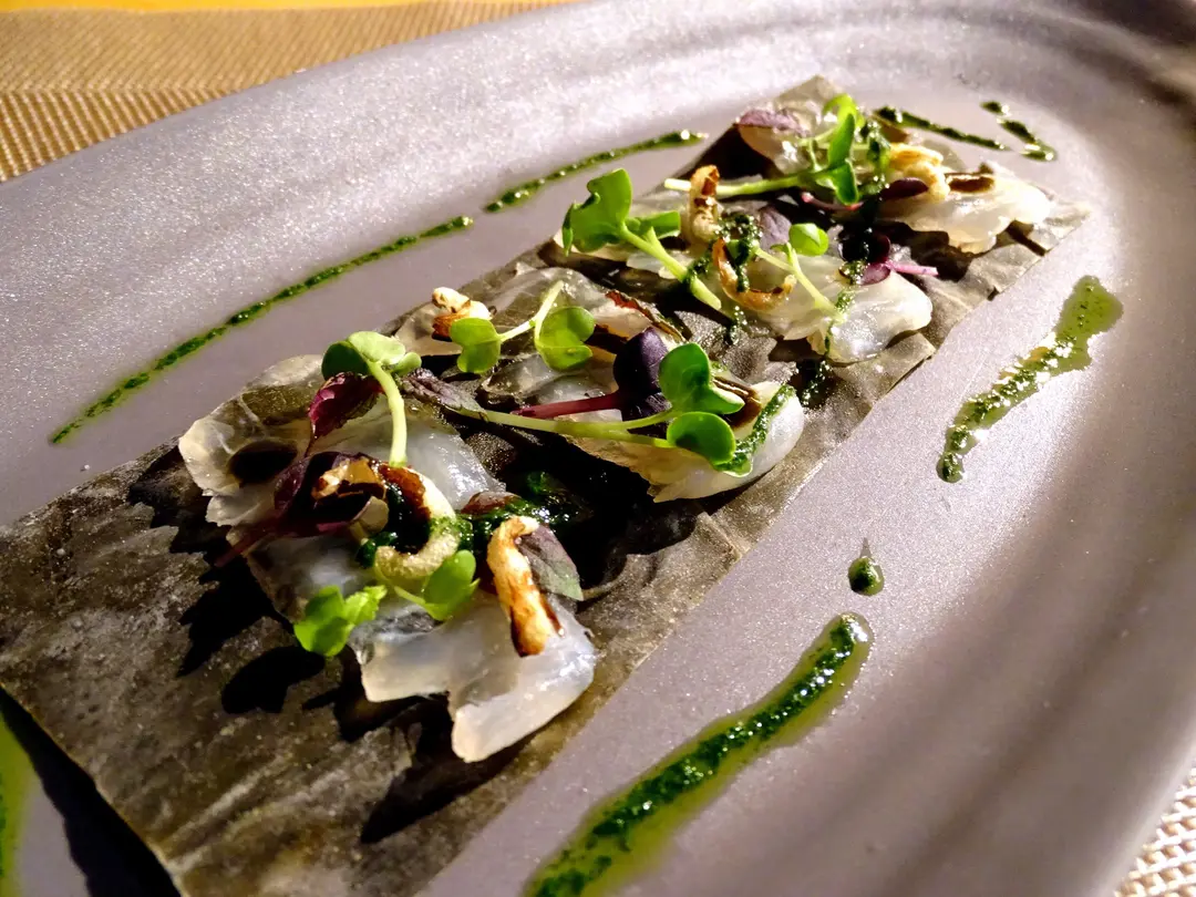konbu cured halibut with nori jam and puffed wild rice
