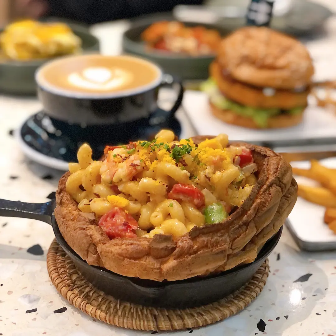 香辣蝦鹹蛋黃忌廉扭紋通粉配荷蘭鬆餅