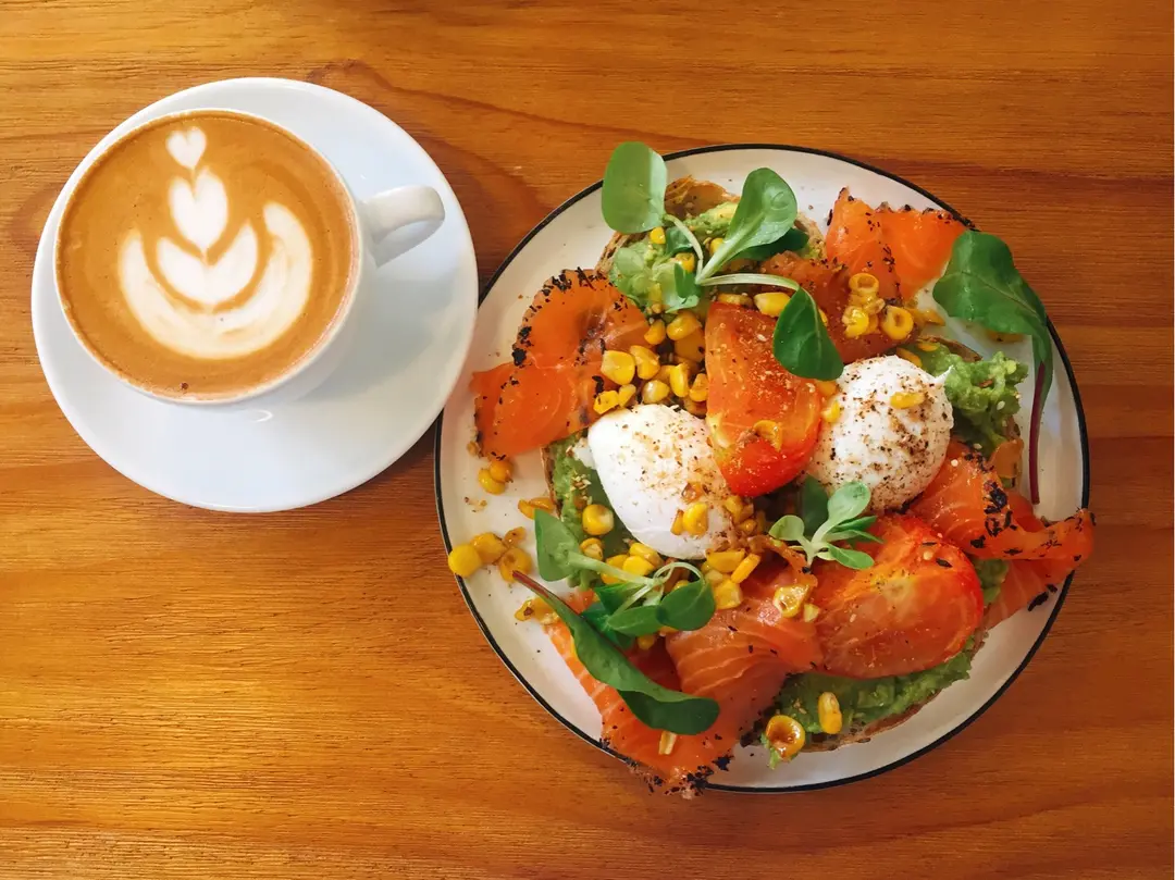 Smashed  avocado,  soft  poached  eggs,  tomato,  charred  corn,  Dukkah,  grain  sourdough  with  cured  Salmon