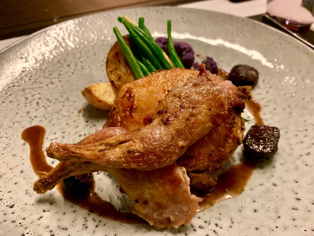 焗鵪鶉釀豬肉開心果配醋煮洋蔥,紅酒汁