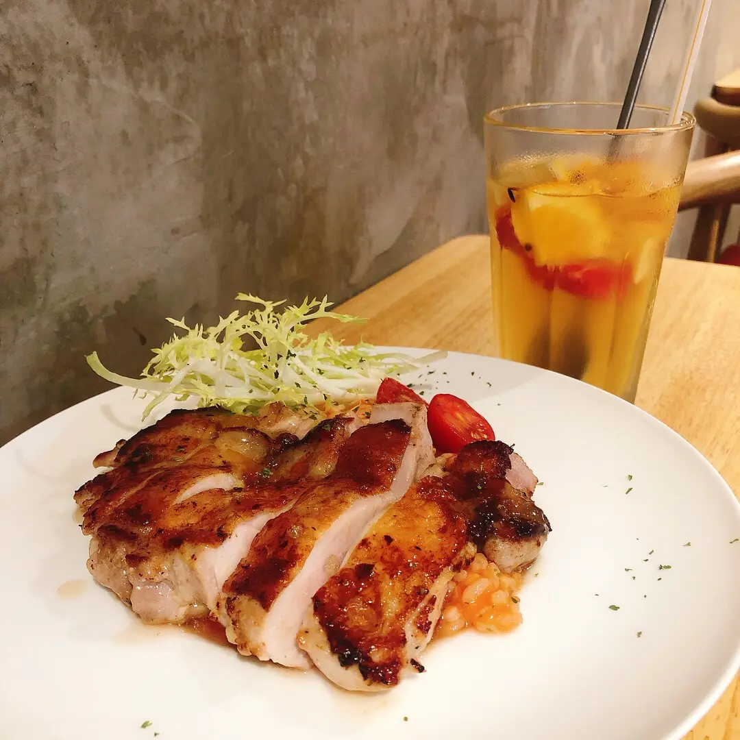 香煎柚子雞腿肉配葡萄牙番茄燴飯