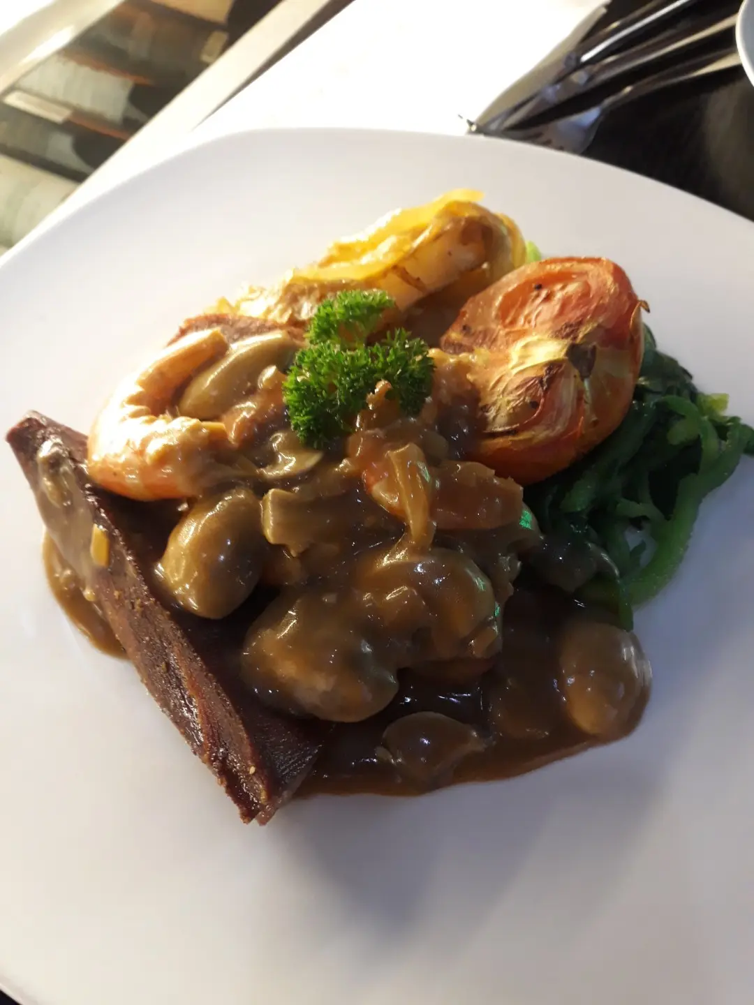 燒牛脷配蝦肉磨菇汁